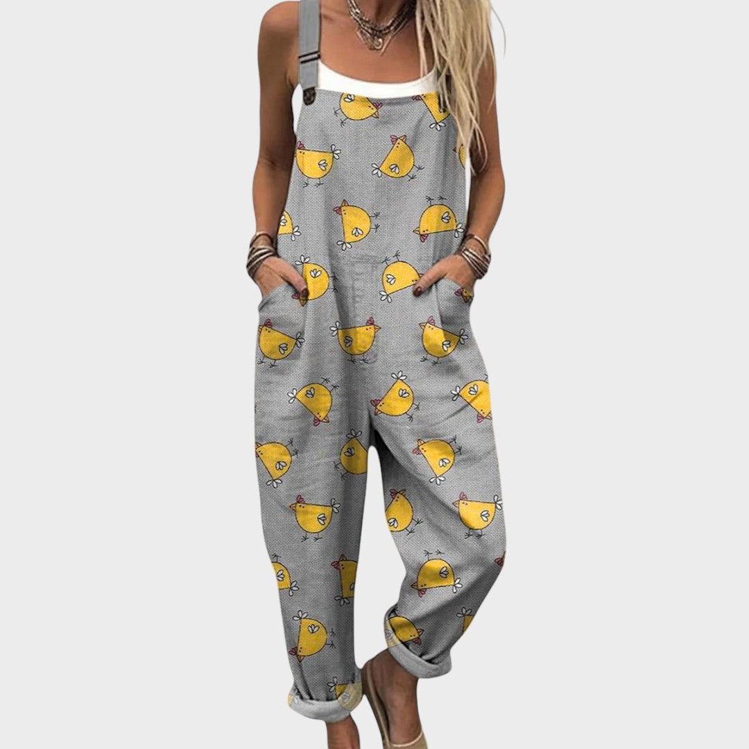 Този лек комбинезон съчетава удобство и уникален дизайн в парче облекло, което ще обожавате да носите всеки ден. С широк силует, практични джобове и игриви детайли, той е перфектен за разходки, излети или релаксиращи моменти у дома.