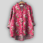 Романтична ленена блузка в интензивен розов нюанс с цветен десен на рози, който излъчва женственост и елегантност. V-образно деколте с дискретни волани и свободен крой осигуряват комфорт и въздушно усещане, докато асиметричният подгъв с по-дълга задна част добавя модерен характер на всяка комбинация.
