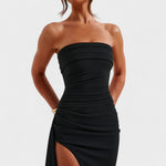 Вечерна Рокля Ефект Импакт е създадена за тези, които искат да оставят следа на всяко събитие. С безрамков дизайн, тесен крой и стратегическо набръчкване, подчертава извивките с изисканост. Дълбокият разрез с ефирен опашка създава движение и стил при всяка стъпка. Идеална за специални поводи, където елегантността и гламурът са задължителни.