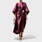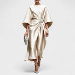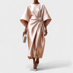 Дълга вечерна рокля с скулптурен силует и разкошен, сатенен блясък. Асиметричното драпиране, събрано с елегантна закопчалка, създава ефект на талия, докато проветривите, широки ръкави и плавното падане на тъканта осигуряват грациозно движение. Идеална за гала събития, сватбени тържества и всяка вечер, когато искаш да блестиш.
