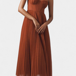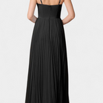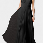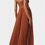 Структуриран романтизъм с силует, който грациозно и присъствуващо тече. Роклята Нивес съчетава мекотата на плисираната шифонена материя с твърдостта на класическия корсет, създавайки магическо равновесие между елегантност и дефиниция. Нейният сърцевиден изрез и пола с форма на камбана нежно обвиват фигурата с характер.