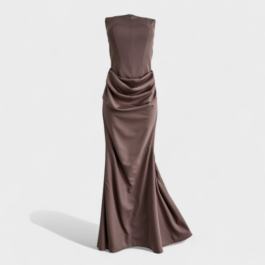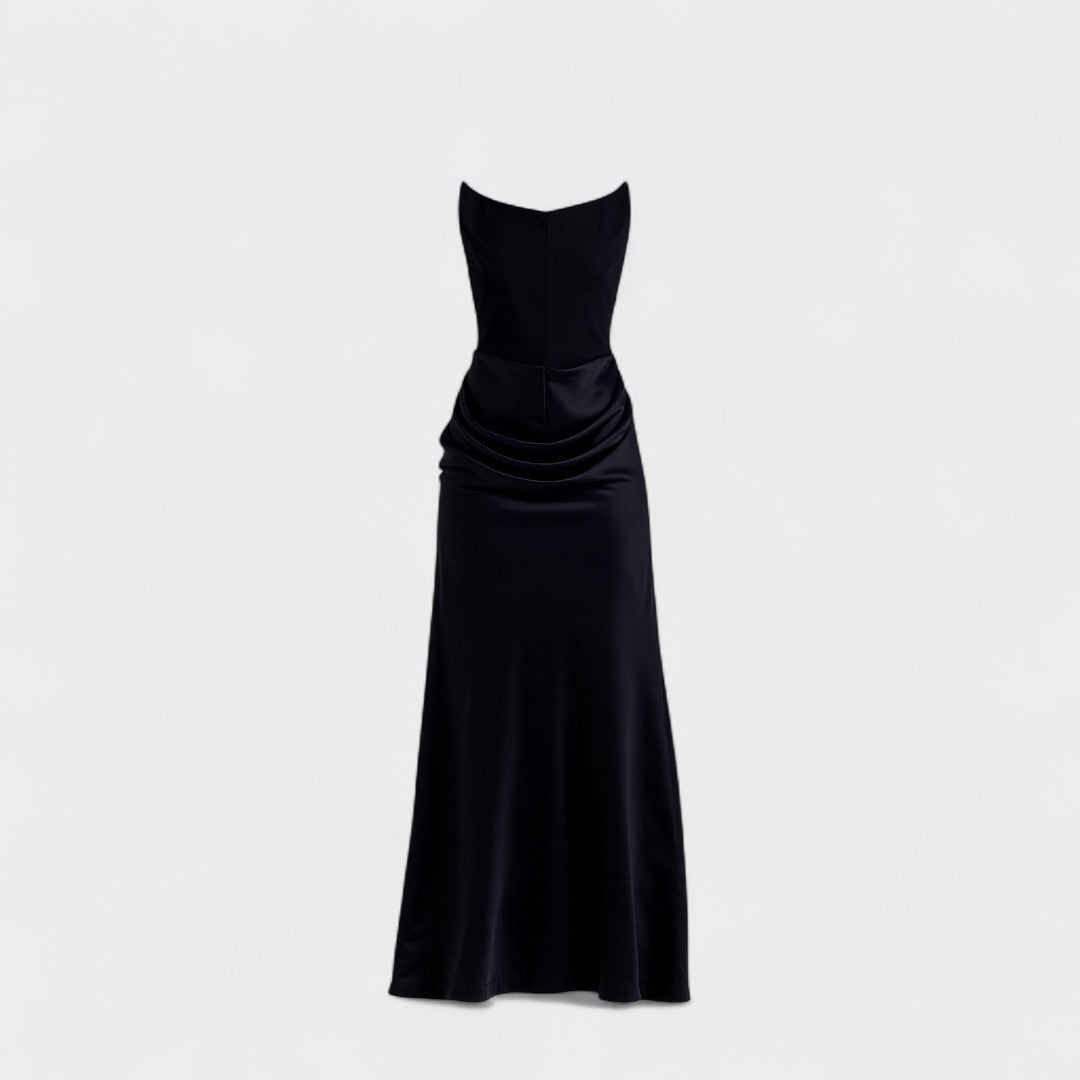 Роклята 'Радмила' представлява временно елегантен стил в най-красивия си вариант. Тази рокля, която достига до пода, има корсетен стил без презрамки, изработена от материя, която предоставя перфектна основа, докато артистичният набор в областта на бедрата създава завидни форми. Персонализираният силует преминава в деликатно разширяване на рибешкия опашка от лъскав сатен, което прави всяка стъпка специална.