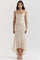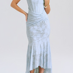 Впечатляваща рокля с индивидуално изрязване и релефен модел, който елегантно обгръща тялото. Оформеният корсет осигурява опора и женствен вид, докато добре проектираните плисета на талията подчертават силуета. Асиметричната пола придава движение и лукс на всеки външен вид.