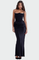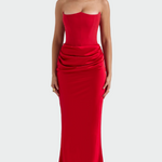 Импозантна и сексуална рокля с корсет без презрамки и тесен крой, който подчертава силуета. Детайлът с елегантен набръчкан колан придава женственост и уникален флуид, докато макси дължината осигурява вечна елегантност. Идеална за тържествени вечери и блестящи изяви.