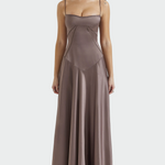 Елегантна и минималистична сатенена рокля, която излъчва вечнаSophistication. С тънки презрамки и дискретни шевове, които подчертават талията, създава женствена и изискана силует. Идеална за вечерни излизания, сватби и специални случаи.