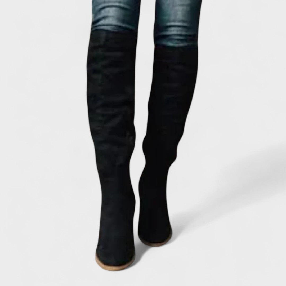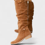 Тези високи ботуши носят градски шик и комфорт в една стъпка. Мекото, леко горнище с елегантни намачквания приляга плътно към крака и предлага отпуснат, изискан вид. Страничният цип позволява бързо обуване, докато ниският блоков ток предлага стабилност за целодневно носене. Субтилни детайли като декоративна катарама придават доза изтънченост, която лесно се съчетава с рокли, поли или дънки. Перфектни за работа, кафе в града или вечерно излизане.