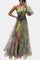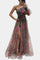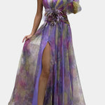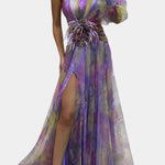 Декларация за стил за събития, които изискват присъствие. Роклята Теодора комбинира скулптурен дизайн с ефирни детайли, от асиметрично деколте до драпирана пола с преден разрез. Акварелен узор и цветна апликация на талията повишават нейната елегантност, създавайки незабравима силуета за изискани тържества.