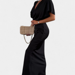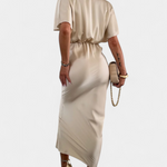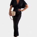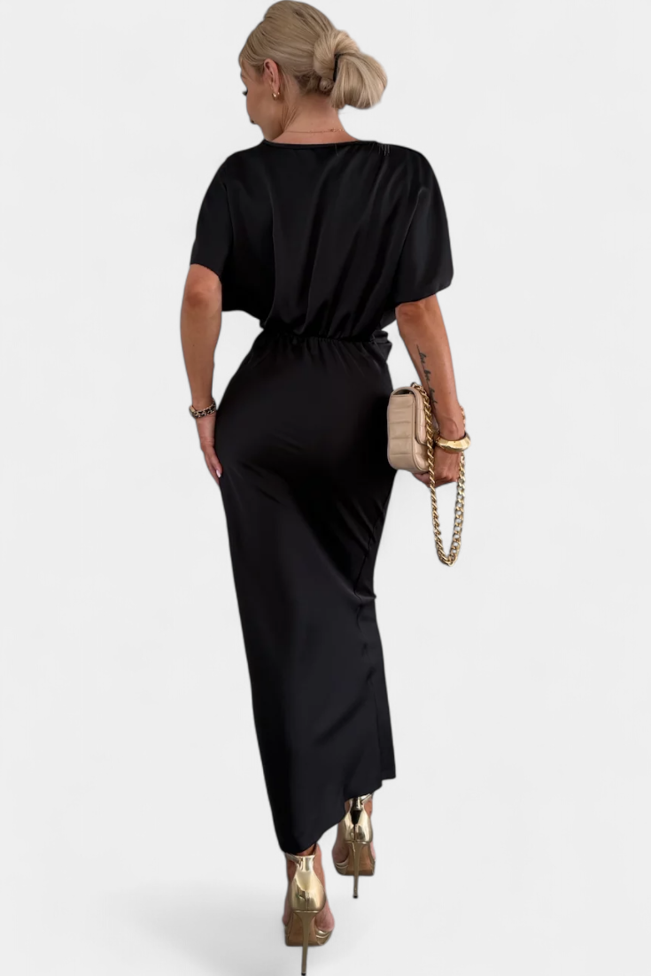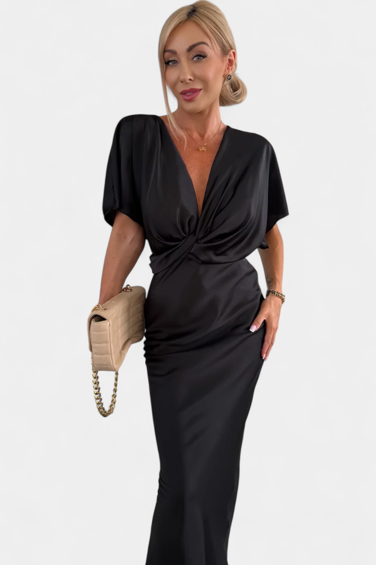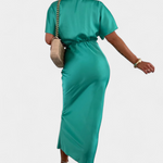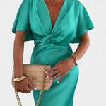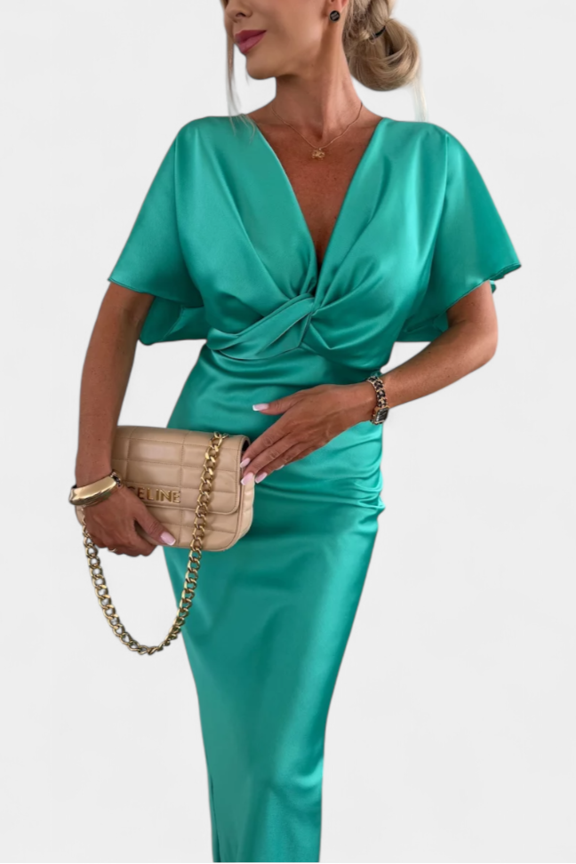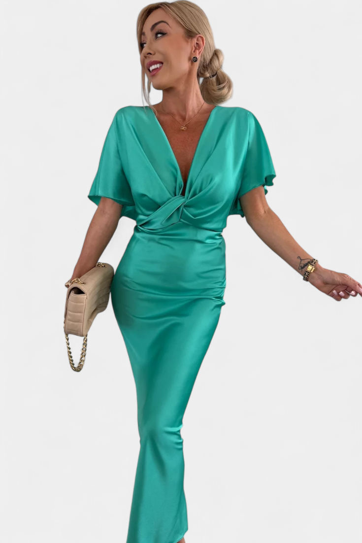 Роклята Нада в едноцветен нюанс предлага идеален баланс между неформален стил и елегантен дизайн. С обвит V-образен деколте, преден кръстосан възел и къси ръкави, тази тясна силуета плавно подчертава фигурата. Идеална е за неформални планове, както и за специални поводи.
