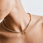 Добавете нотка разкош с огърлицата Ривиер, покрита с 14K злато. Тази изискана бижутерия представя непрекъсната линия от блестящи камъни, създаваща зашеметяващ и елегантен ефект. Перфектна за всеки повод, тя предлага класическо и бляскаво излъчване, което издига вашия стил.